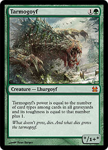 He’ll lose before he has a chance to cast his second card, Rufus thought as he looked at the casting cost of each card. Only one had a viable casting cost. The other was far too expensive to be played competitively.“Those are some nice cards,” Rufus said feigning an interest. “If they are both out at once I can see how they could really take over a game,” Rufus said.“Exactly!” The boy said. “I have trouble with flyers though,” the boy admitted. “And people that like to block,” the boy finished. Obviously, Rufus thought.“Well here how about we make a trade,” Rufus said. He reached into his backpack and pulled out his own three ring binder. It was far smaller than the boy’s, and most of the pages were empty, or at least mostly so. “I’ll trade you this guy for your cute Tarmogoyf card,” Rufus said as he flipped to a semi filled page of his binder and pulled out a card. He placed the card face up in front of the boy.