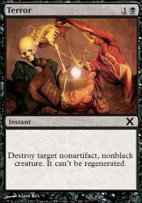 He placed the spell on the table for Rufus to read, then took the top card of his deck and put it face down on the table, placing another ghostly manifest token on top of it. He then took another die from his deck box and placed it on top of his new creature. Five dots pointed upwards at the ceiling signalling the new creature’s strength was even greater than his previous one. Rufus felt his heart quicken. As they were Jason’s creatures, wouldn’t be enough to finish him, despite their size. But there was always the threat that something bigger lay beneath. To ensure his victory he’d have to get rid of at least one of them. Rufus scanned his opponents board state. He noticed the die above Jason’s scroll had moved from one dot, to two. Jason attacked with his smaller creature. Rufus let it pass once more. He moved his life die to twelve. Jason passed the turn.Rufus drew a card. Yes, finally! Rufus thought to himself. Victory was his. He tapped two of his swamps sideways and placed his new card on the table.‘Terror’
