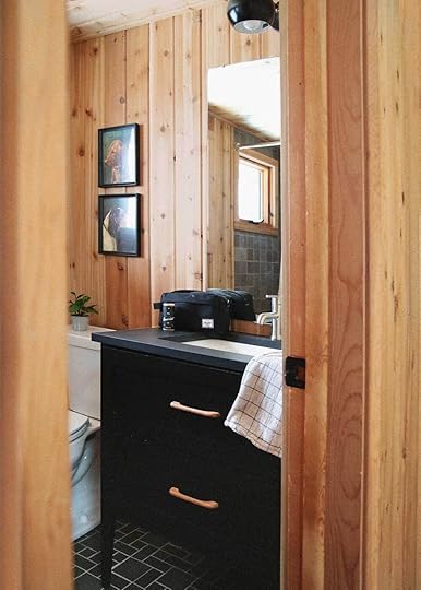 The downstairs cabin bathroom was decently large for a cabin bathroom. It was quaint, too, and lined with cedar and plywood like the rest of the cabin. The orientation of everything was just a little askew. The toilet sat ever so close to the vanity with a full view to the hallway. And the shower was tucked in a dark cove, away from the window.