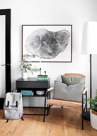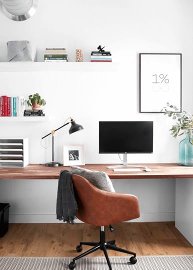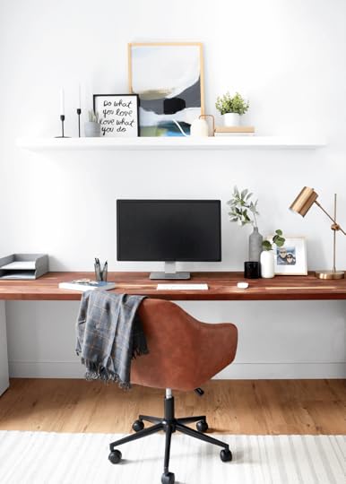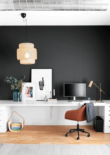 So, we separated her office into three zones: computer work, offline work, and photography studio. We added a huge desk to flank the work wall, weighting it with a coat of black paint, giving her multiple workspaces within one, an online and offline space. We gave her a small seating area for two-person meetings or occasional offline reading. On the other side of her office, we flanked the wall with shelving, to add both balance and storage. The open shelving was designed to house all her styling props while also standing in as decor. By the windows, she has a shooting cart for photography.