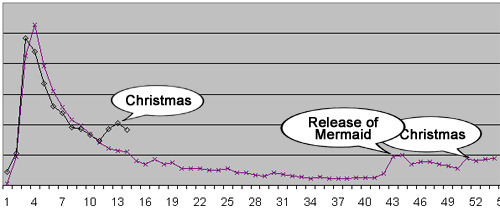 This is a graph of the sales for The Stepsister Scheme (purple line) and The Mermaid's Madness (black line). Stepsister has been selling for just over a year now, and Mermaid has been out for about three months.