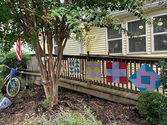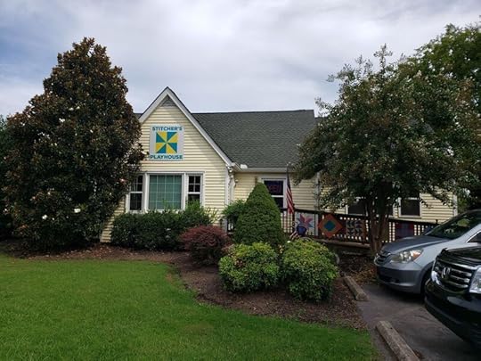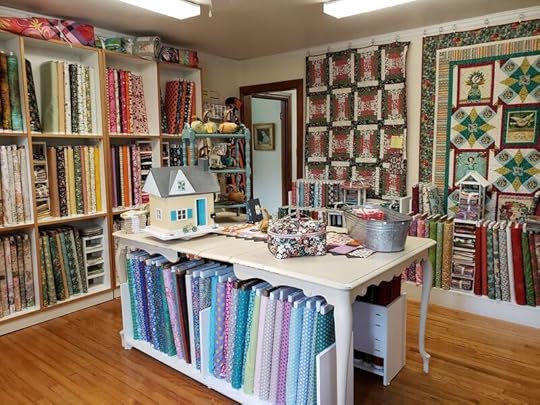 Did I model this after a real shop? Yes and no. Here in the town I live in, we have a quilt shop called Stitcher's Playhouse. It's also an old house remodeled into a store. As you can see in the pictures below, it has various rooms of fabric, old sewing machines on display, along with quilts and other already-sewn items. Across the front are barn quilt squares, which I also love. There's a good-sized classroom farther back in the building, but I didn't get a picture of it the day I was there because I didn't want to interrupt the class going on. And you can see all the beautiful fabrics. I love going out there and almost always come away with at least a fat quarter or two.