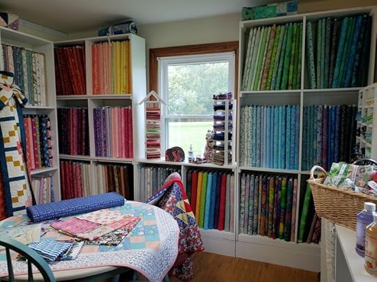 So, my story is set in a quilt shop called The Missing Piece. It's in an old house that was redone into a store, but still has the character of different rooms and areas for fabric to be. There's a classroom in the back corner of the house (the former master bedroom), a room set up for people who need a place to sew, cutting tables here and there, and, of course, shelves of fabric.
