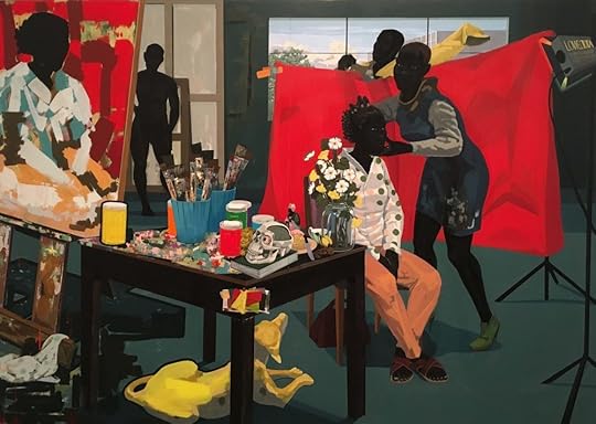 I'm including here one of Marshall's monumental pieces (Untitled (Studio) 2014, Acrylic on PVC panels) and his words from a short video produced by the museum. The painting is a favorite of mine, in part because of the subject matter: it shows the studio Marshall visited in the seventh grade, which was the first time (by his own accounts) that he realized that he could be an artist. The museum commentary describes the scene of the painting as "a place of labor where an allegorical catalogue of all modes of art making is on display." To my eye, the brushes could be pens; the canvases could be blank paper; the art students could be young writers. Or singers. Or dancers. Or sculptors. Here are the things we use to create our particular art. But the creation is all one.