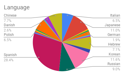 Korean (4), Japanese (2), Spanish (2), Chinese (1), Danish (1), Italian (1), Polish (1), Portuguese (1), Russian (1)