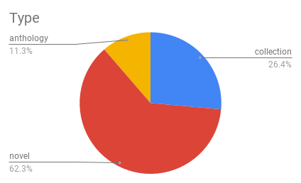 This year, I tried something different. Instead of just looking at how many short stories were published in magazines/webzines, and then grouping collections with novels and anthologies (while not pulling out the separate short stories in those collections), I decided to lay out how many short stories were published in zines and how many were published in collections. Collections (as singular items) are still counted in the “long-form fiction” category below, but now we can more clearly see how collections of stories contribute to the percentages of certain source languages.