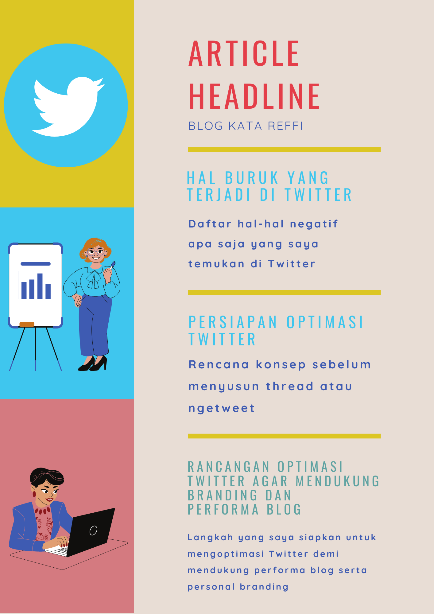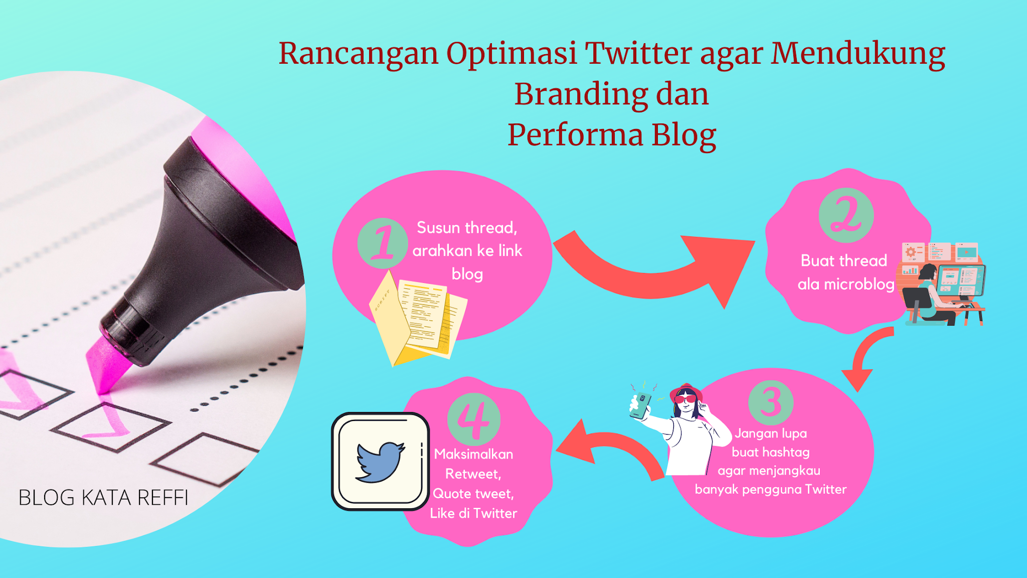 Twitter adalah media sosial yang paling sering saya gunakan. Sebagai seorang bloger, mengaktifkan medsos untuk promosi tulisan tentunya menjadi keharusan. Ternyata masih banyak yang harus saya pelajari soal memanfaatkan Twitter ini. Jika tahu strategi optimasinya, tentu akan berpengaruh baik untuk blog dan personal branding.