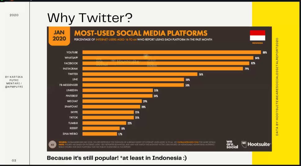 Saat mengikuti materi yang disampaikan oleh Mbak Kartika, saya berkata dalam hati, “Wah ada yang sudah kulakukan dan ada yang belum kupraktikkan nih supaya artikelku lebih bagus engagementnya.” Apalagi Twitter termasuk dalam jajaran lima besar medsos yang paling banyak digunakan. Kesempatan meningkatkan engagement tentunya menjadi peluang yang sangat bagus.
