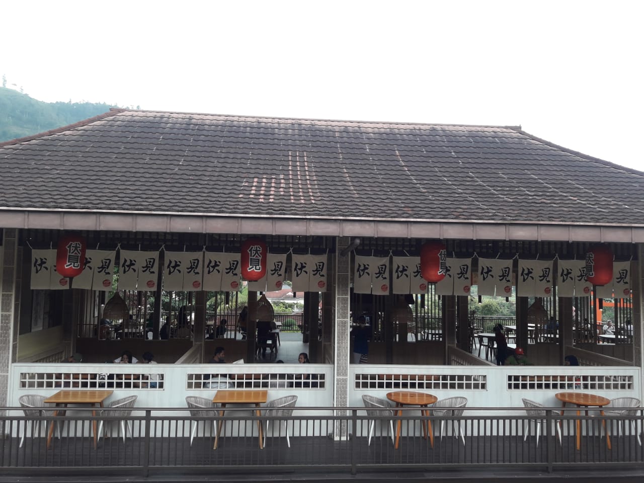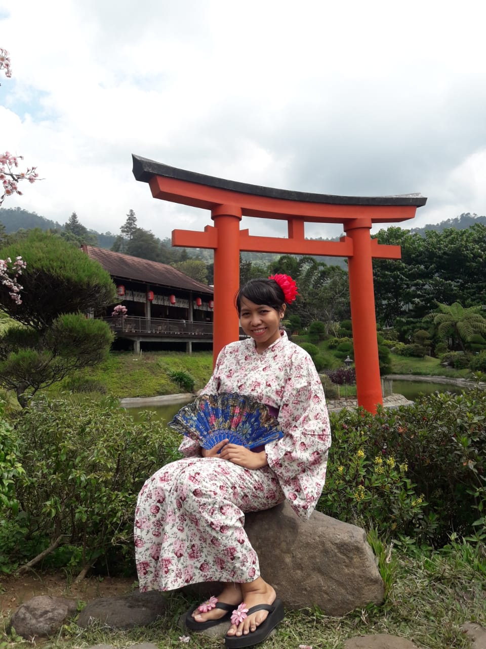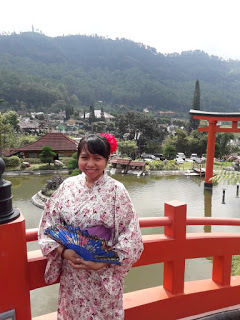 Karena sudah lama tidak memakai yukata—terakhir kali saat masih kuliah—saya harus berhati-hati agar tidak terpeleset. Biasa memakai celana panjang jelas saja gaya berjalan saya jadi sangat kaku. Meskipun cuaca terik, saya tak merasa kepanasan. Angin yang bertiup cenderung sejuk dan segar. Spot incaran adalah di jembatan kayu dan dekat gerbang ala Jepang yang juga berwarna merah. Yang saya suka selain spot-spot fotonya, desain bangunan yang memang mengusung suasana tradisional Jepang dengan dominan bahan kayu dan bambu, membuat saya merasa seolah sedang berada di perkampungan kuno Jepang.
