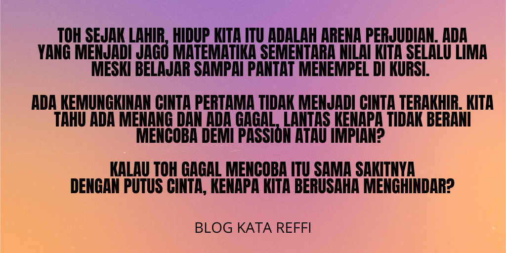 Toh sejak lahir, hidup kita itu adalah arena perjudian. Ada yang menjadi jago Matematika sementara nilai kita selalu lima meski belajar sampai pantat menempel di kursi. Ada kemungkinan cinta pertama tidak menjadi cinta terakhir. Kita tahu ada menang dan ada gagal, lantas kenapa tidak berani mencoba demi passion atau impian? Kalau toh gagal mencoba itu sama sakitnya dengan putus cinta, kenapa kita berusaha menghindar?