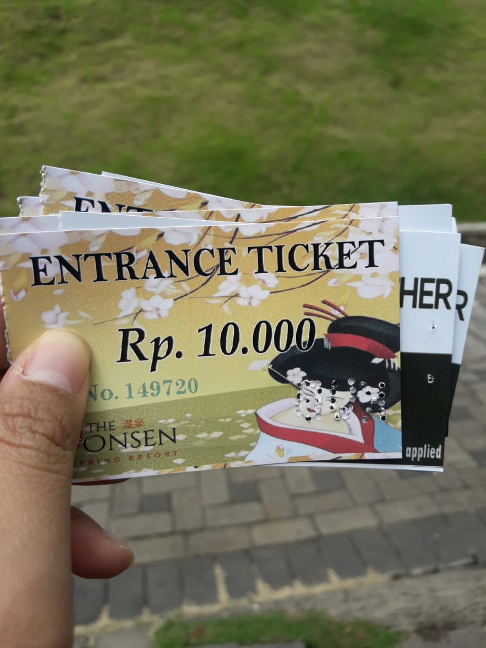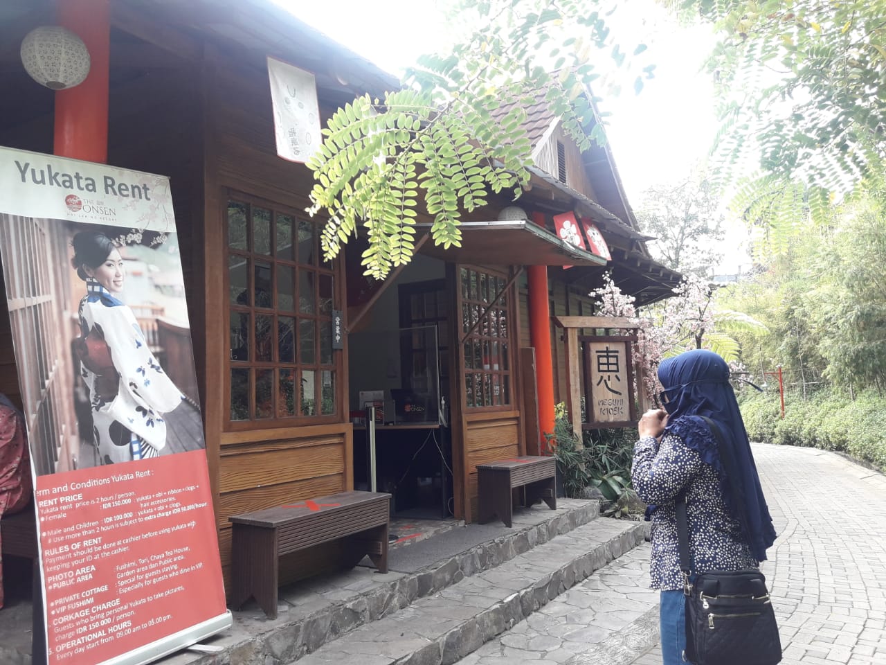 Bagi yang tidak menginap seperti saya dan keluarga, hanya perlu membayar tiket masuk sebesar Rp50.000. Terkesan mahal kelihatannya tetapi tiket ini sistemnya bundling. Untuk tiket masuk sebenarnya hanya sepuluh ribu rupiah dan sisanya adalah voucher restoran Fushimi yang bisa kita gunakan untuk membeli makanan dan minuman. Karena tujuan utama adalah untuk berfoto ria, kami bergegas ke stan penyewaan yukata dan hakama. Nah, saran dari petugas stan, kalau hari libur biasanya yang menyewa harus antri panjang. Beruntung saya datang di hari-hari sepi jadi tak perlu menunggu lama.