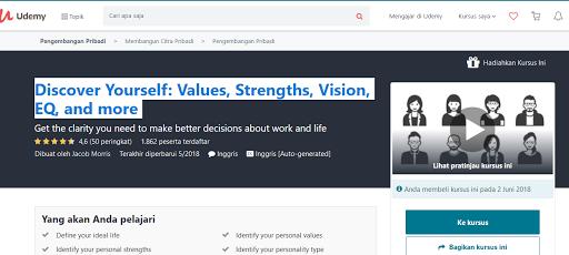 Kalau kursus ini masih sedang dalam proses saya pelajari. Baru selesai dua bab dan saya rasa kursusnya cukup recommended. Berdiam lama di rumah seringkali membuat kita tertekan dan merasa kurang produktif. Inilah saatnya kita mengevaluasi kegagalan dan impian yang ingin dicapai. Slow life but not slow thinking. Belajar mengenali nilai diri, kekuatan, visi dan emosi akan membuat kita makin siap selama masa pandemi masih belum usai. Ikuti kursusnya di link ini.