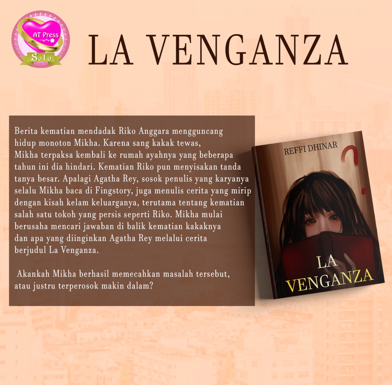 Kalimat itu tertanam dan mendorong saya ingin keluar dari zona nyaman. Akhirnya dimulailah perjalanan cerita berjudul La Venganza. Awalnya novel ini mau saya beri judul Revenge. Tetapi ketika saya cek di Google, judul ini banyak sekali kembarannya. Karena itu akhirnya saya coba cari judul dari bahasa asing hingga menemukan dalam bahasa sapnyol. La Venganza pun terpilih menjadi judul pilihan.