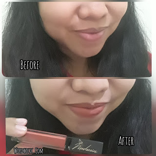 Cukup sekali pulas untuk tiap bibir, lalu oles pelan-pelan sampai merata. Sewaktu dipakai minum juga tidak meninggalkan bekas di gelas. Saya pakai makan juga tidak cepat lenyap warnanya. Memakai Lip Matte Madezain tidak butuh tambahan lip balm, bibir saya juga tidak kering. Kandungan Vitamin E, moisturizer, dan Emollient di dalam produknya bisa melembabkan bibir dan memberi nutrisi. Oya, sesuai info di akun Instagramnya, lip matte ini bisa dipakai wudu juga.