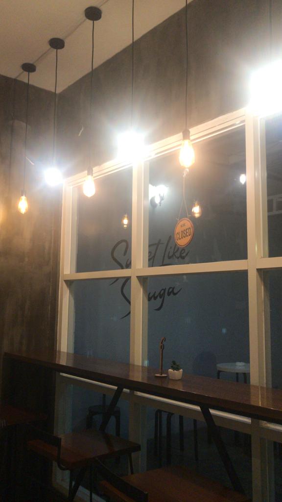 Lokasi kafe tidak berada tepat di tepi jalan utama, tetapi lokasinya mudah ditemukan. Shuga Café berlokasi di Jl. Kutuk Barat No.66, Cangkring, Sidokare. Kita langsung tahu jika kafe ini mengutamakan desain minimalis dan clean. Bagi penyuka vintage seperti saya, pemilihan meja dan kursi serta dinding yang dicat warna hitam putih, membuat saya merasa nyaman. Ada bagian tembok yang polos saja tanpa warna cat tertentu, semacam unfinished design dengan gambar dinding dari kapur warna.