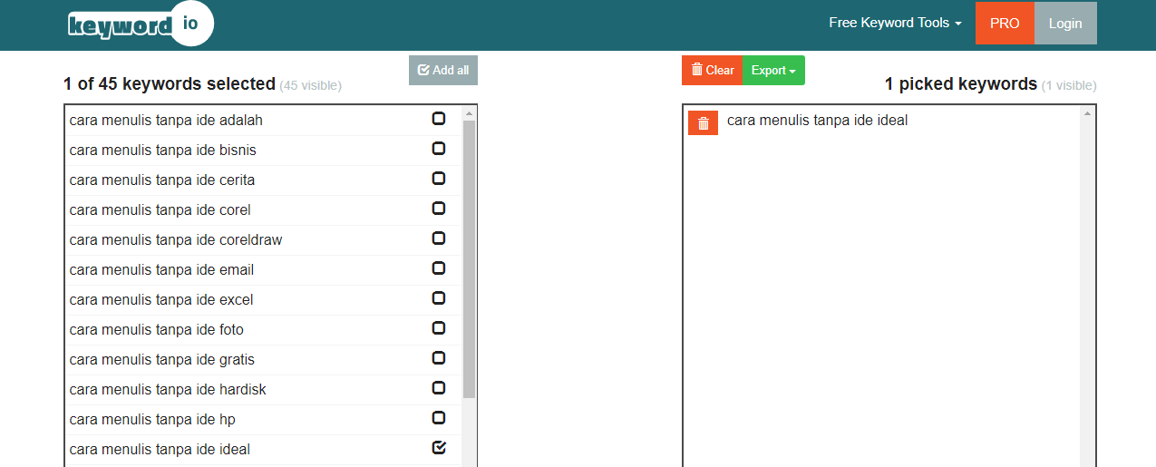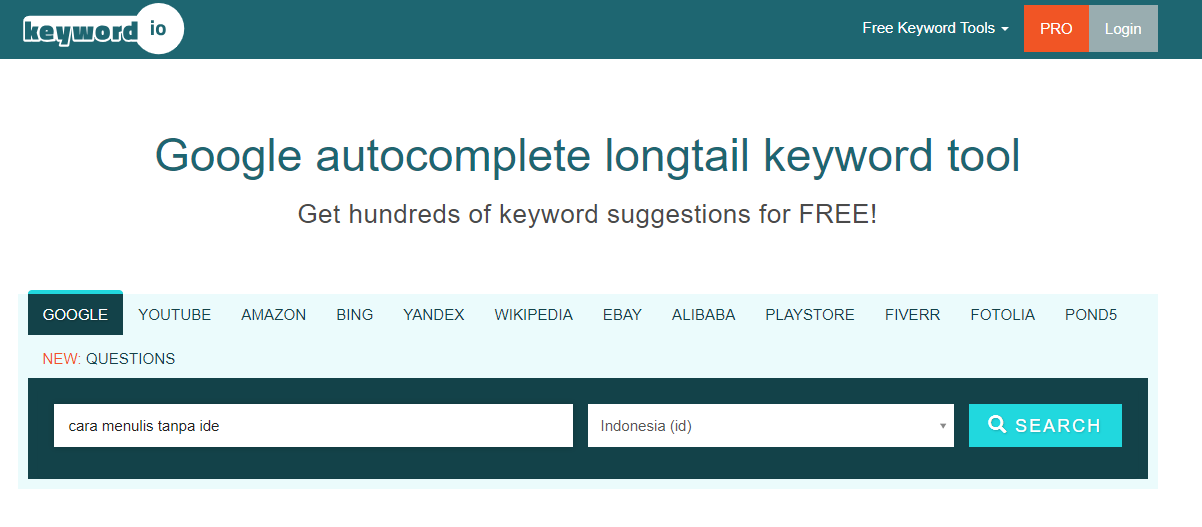 Menulis Keyword Apa Saja di Situs Keyword PlannerBiasanya keyword planner ini digunakan untuk membuat artikel SEO. Blogger akan menyertakan kata kunci di bagian tubuh postingan agar ranking blognya meningkat di pencarian Google. Ternyata, keyword planner juga bisa saya pakai untuk mencari pemantik ide. Saya menggunakan www.keyword.iolalu mengklik kata kunci ‘cara menulis tanpa ide’.