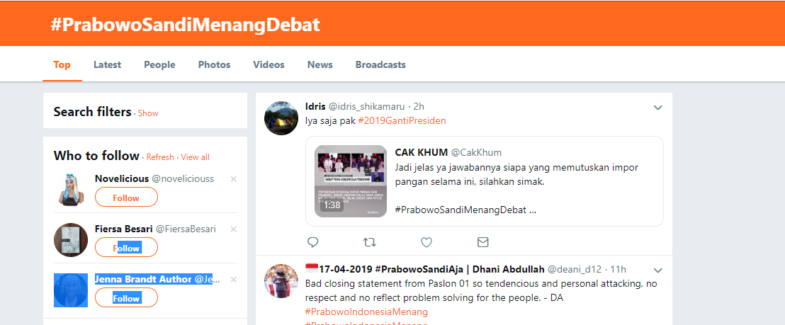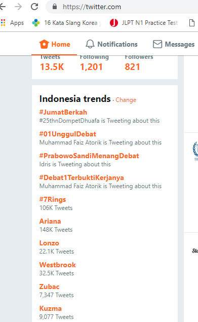 Mengecek Trend Media SosialSebagai pengguna aktif media sosial, pasti sudah familiar dengan hashtag, bukan? Biasanya ketika ingin mengecek berita terkini, saya cenderung lebih menyukai mengecek hashtag di twitter. Settingan hashtag di Twitter juga bisa dibuat sesuai negara yang ingin kita lihat. Misalnya ‘Indonesia Trends’, bisa dicek apa saja yang menjadi cuitan favorit para pengguna Twitter. Seperti yang saya cek di bawah ini, terlihat jika topik debat capres menjadi perbincangan yang ramai di Twitter. Meskipun saya tidak menonton acara debatnya, saya bisa mengecek perkembangan acaranya.