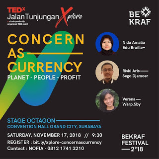 Lalu ketika mengetahui jika ternyata di Surabaya juga akan menyelenggarakan acara inspiratif sejenis, tentu saja saya tidak ingin melewatkannya. TedX Jalan Tunjungan membuat acara bertajuk ‘Concern As Currency—Planet, People, Profit’ pada event Bekraf Festival 2018. Saat mengecek tanggal, ternyata 17 November itu hari Sabtu, pas saat libur kerja, maka saya berangkat menuju lokasi.