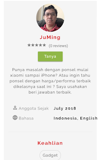 Pada percobaan pertama kali ini, saya berkonsultasi dengan salah satu pakar Gadget. Dari salah satu pakar yang akan saya ajak konsultasi bernama JuMing, saya ingin bertanya mengenai spesifikasi smartphone yang bagus untuk belajar fotografi. Banyak sekali smartphone yang mengunggulkan kualitas kameranya, tetapi karena saya bingung, rasanya bertanya pada ahli secara privat itu jauh lebih baik. Selain kita bisa bertanya langsung ke pakar, kita juga bisa mendapat referensi terpercaya dari pengalaman pakar. Seperti JuMing ini, disebutkan di profilnya jika ia pernah bekerja di dua perusahaan ponsel ternama. Jadi soal keahlian dan wawasan tidak perlu diragukan lagi.