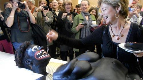 Men hallå, vad är det som har hänt? Utanför Stefan Jonssons överhettade hjärna, alltså. En minister har förletts till att skära för sig en bit ur en tårta. Om hon nu åt av den, vilket vi får anta, blir hon då också en kannibal? Hon kanske borde ha anat argan list och avstått därför att tårtan var formad som en svart kvinna men eftersom det handlade om konst och de närvarande verkade tycka att hon skulle ta för sig av tårtan, så gjorde hon det. Som en annan av DN:s dåvarande kulturskribenter, Kajsa Ekis Ekman, konstaterade:
