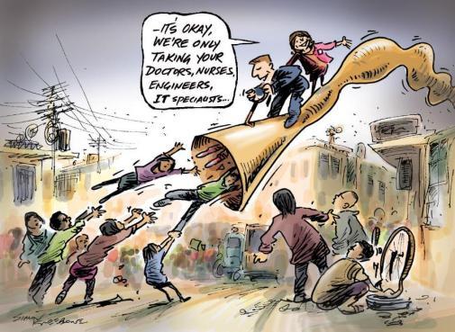 Den asylrelaterade invandringen är inte, vilket ibland påstås, ett “kompetensregn” över Sverige. Majoriteten är immigranter från Mellanöstern och Afrika. Även om de inte klarar att konkurrera på den svenska arbetsmarknaden är många av dem bättre utbildade och med starkare vilja att skapa sig en framtid, än de som stannar kvar. Där finns också läkare, ingenjörer och andra värdefulla specialister, som föredrar en framtid i ett välfärdsland. Frågan är om Sverige med gott samvete kan dränera dessa u-länder på den viktigaste resurs de har, nämligen kunskap och intelligens? Mycket tyder på att tillgång på råvaror inte är lika viktig som hög utbildning och hög intelligens, för att skapa ett nationellt välstånd. Ett utvecklat land som Sverige bör rimligen klara av att utbilda sin egen intelligenta del av befolkningen och ha moral nog att inte stjäla den resursen från fattiga länder i omvärlden.