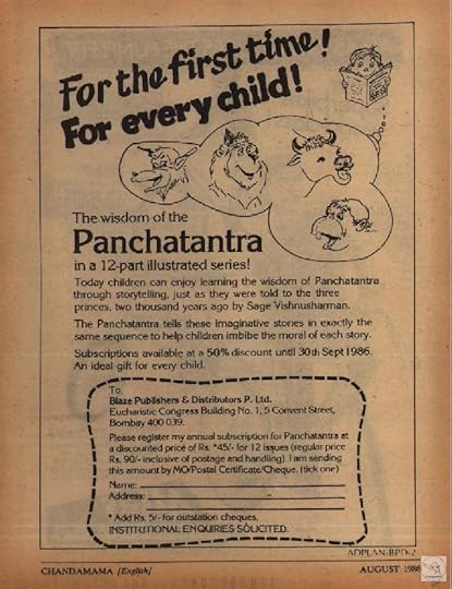 So during my childhood, Panchatantra was a staple diet for the mind. It was delivered via the most popular children’s magazine of those days – Chandamama. It is disheartening to note that this magazine that provided so many Indian tales to Indian Children in Hindi, English, Sanskrit and their mother tongues has been discontinued. At the same time it was a pleasant surprise to come across their website where they have put many old issues in different languages. I am not sure if any Indian magazine is published these days for children with exclusive desi content.