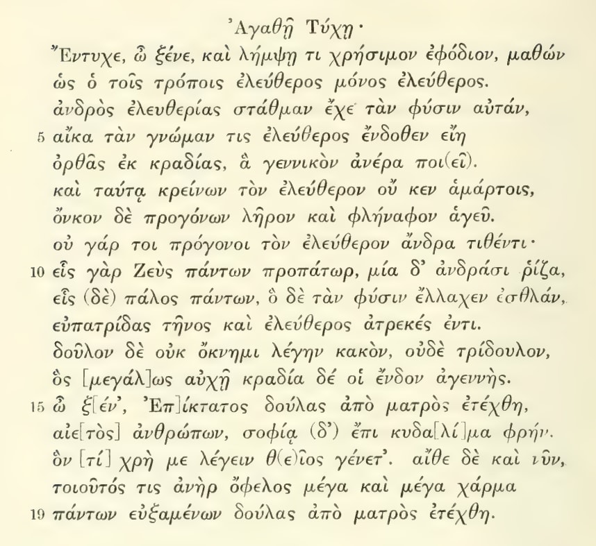 As you will see, the poem not only praises Epictetus, but distills elements of his Stoic philosophy. Its central message is that true freedom is a state of mind, which comes from relinquishing our attachment to external goods, such as wealth and reputation.