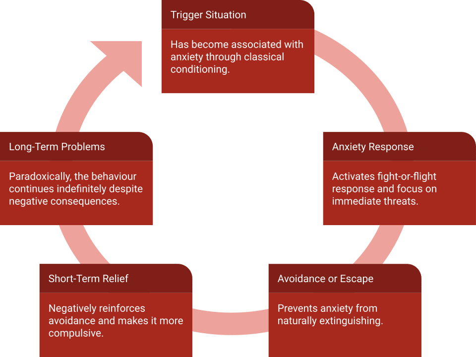 Avoidance relieves anxiety in the short-term but maintains it in the long-term.