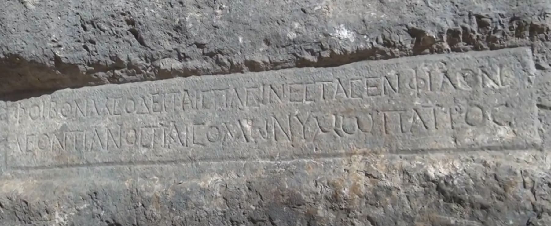 Part of the inscription, based on a close-up from the YouTube video below.The video clip below shows the area of the pass where the plaque and inscription are located. The section showing an inscription on the rock face, and the plaque nearby, begins at around 13:00 (timestamp). This inscription appears to be the dedication to Apollo recorded by Sterrett, which I believe says:
