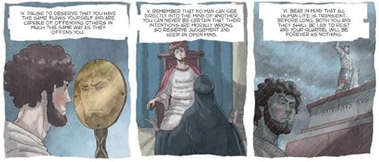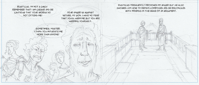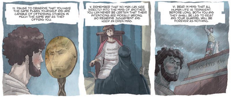 Marcus Aurelius was an exceptional ruler, in part, because he dedicated his life to training in Stoicism, including conquering his own anger. We wanted to bring his struggles to life in Verissimus, our graphic novel, through illustrations like the ones above, in order to put a more human face on ancient Stoicism. The more you can visualize a real historical figure using these anger-management strategies, and other aspects of Stoicism, the easier it becomes to do so in your own life.