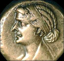 She seems to me to have very strongly identified with her Greek heritage and, based on surviving depictions, she was probably a pale-skinned woman with a large, possibly quite aquiline, nose, big eyes, and reddish-brown hair, which is usually neatly braided. She is always shown with the Macedonian royal diadem, a linen ribbon woven with gold thread bearing a jewel in the center, worn by Hellenistic (Greek) monarchs since the time of Alexander.