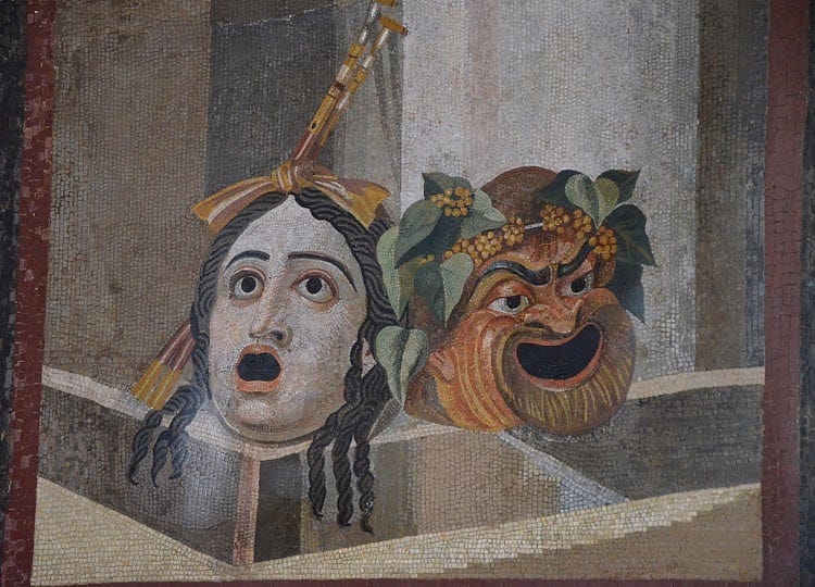 2nd century CE Roman mosaic, depicting female and male theatrical masksThis distinction is also alluded to in ancient literature. For example, Andrea Sinclair’s Unmasking Ancient Colour, discusses the evidence found in a 2nd century CE text, the Onomasticon of Julius Pollux, which describes the appearance of theatrical masks.