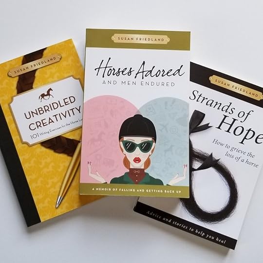 I first came across Susan Friedland’s books: Horses Adored and Men Endured: A Memoir of Falling Off and Getting Back Up, Strands of Hope: How to Grieve the Loss of a Horse - Advice and Stories to Help You Heal, and Unbridled Creativity: 101 Writing Exercises for the Horse Lover a few months ago, but didn’t have the time to purchase and read them until now. I have to say I enjoyed reading all of her books.