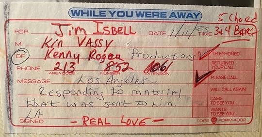 The memo below is from a couple of years later, 1985, when Kin Vassy called from California to say Kenny Rogers was interested in my song “Real Love.” Nothing ever came of that interest, but it was an exciting possibility for a while!