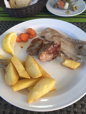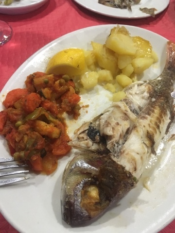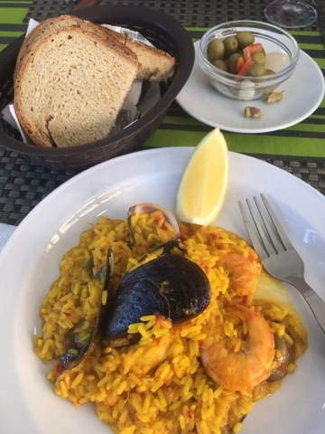 Lunch is big meal here in southern Spain. There are a few places open, enough to feed the locals and a few stray tourists. The Menu Del Dia is the way to go a lunch. A first plate, a second plate, a dessert and a drink. Depending on the locale, this large lunch will set a traveler back 7-9 Euro. Today I went with the paella as a first plate. As always, there are olives and bread.
