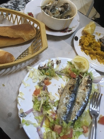 A plate of paella and a plate of grilled sardines will make a nice second course. Eat what you want, make a big mess, it does not matter. The paper will catch all the bread crumbs and fish bones. The same paper, torn into squares, serves as a napkin. The total cost for this feast? Forty-five dirhams. That comes to about $5.50 in US dollars, dinner for two.