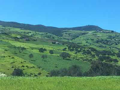 The bus wound its way out of Tangier, heading for the open country east of the city. This has been the wettest (and coldest) spring that folks around here can remember. The hills and fields were a lush green. Herdsmen (and women) were grazing their sheep, goats, cows and horses on the thick grass along the highway. Donkeys bearing laden cargo frames pulled obstinately at their lead ropes.