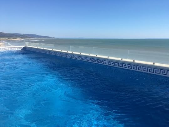 Ii is still the off-season here, too cold for swimming, but not so cold that the locals aren't ready for the tourists. Our vacation apartment building was almost empty, but that will change. Atop the building, the pool is filled and ready. There is the blue of the pool, and the green-brown-blue of the bay.