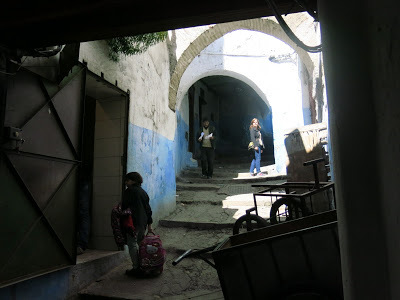 To wander in the Medina is to wander in shadow and light. There are passageways that rarely see the sun, and then only for the briefest time. Tétouan is even more tangled, even more of a maze, than the Kasbah in Tangier. I feel as if this trip has been a sliding scale, growing closer and more maze-like with each town. Sevilla has its quaint lanes and narrow roads, but not as narrow as Tarifa. Tarifa, with all of the tourist boutiques, is a Disneyland version of a Moroccan town. The Kasbah in Tangier defies compass or direction, but the Medina of Tétouan makes even Bangkok look simply and well laid out.