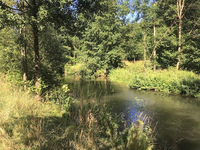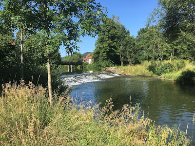 So passed the time. Sunday morning dawned, cool and bright. I was up and about before the dining room opened, walking out to savor the quiet. Today there would be one more hike, this time retracing my steps back down the valley to the little town of Ebermannstadt. From there, I would take the tiny two-wagon train to Forcheim, then Nuremberg, and hence the ICE speeding back to Wien. I had the luxury of time, time to enjoy a leisurely breakfast, coffee on the terrace, a last cigar smoked amongst friends. Then the motos would line up and depart, spreading out across Europe, heading back to homes scattered across the continent. And I, I would shoulder my pack and walk down the green valley.
