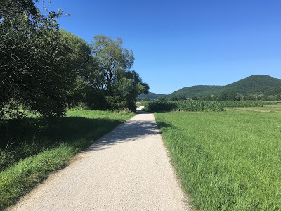 The countryside hereabouts is tidy. The streets are tidy, the paths are tidy, the houses are tidy, everything in its appointed place. As I revved up to full hiking pace, I wondered if I would have to pass a test or something, a checkpoint to approve the appearance of my gear. I knew I would fail any such examination. For one thing, I had no poles. I believe there is a regulation on the books somewhere, both in Austria and Germany, that one cannot hike without Nordic walking sticks. These people are nuts for the things, flailing them about as they hike. I had none. As an added offense, I was smoking a short cigar as I strode along. I'm sure that's also verboten in the hiking rule book.