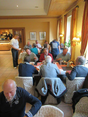 Then there was the sign for the hamlet of Veilbronn, the promised turn in the trail, the hotel. A row of motos stood outside of Landhaus Sponsel-Regus, with folks milling about on the street-side terrace. I walked up the front steps and into the outstretched hand of Steve W., an old friend from Seattle. There were introductions all around, an impossible array of names, and the strangeness of suddenly adding a face to folks I heretofore had known only online. I was saved the embarrassment of remembering everyone, at least for the present, by the call to dinner. And thus began a three day food orgy.