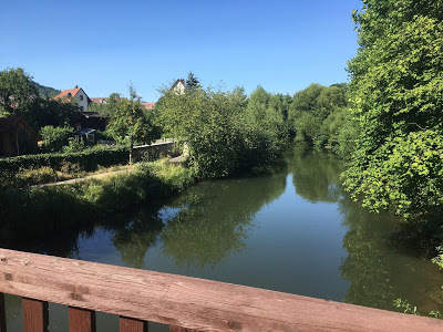 I am standing alongside a small pathway. The pathway runs along a lazy creek in a green wood. To my left, behind low stone walls, is the village of Ebermannstadt. Stepping off of the tiny two-wagon electric train is to step into a postcard. The scene is made less picturesque by interposing the image of myself, clad only in my underwear, donning my hiking shorts and shoes. If you were watching, sorry for that.