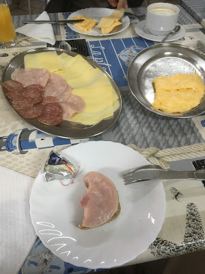 Brekkie at the HotelThis morning, the two other guests in the Frane Guesthouse rode away on their German motos. We were the only guests remaining in the hotel. Our very congenial host saw to our breakfast. Tended to a slow conversation as he trundled plates to our table, he told us of the battles with the salt winds. He spoke of trying to keep the roses and jasmine alive. He told us the Croatian names for the different winds, winds of the east and the south, but mostly the salt winds of the north.
