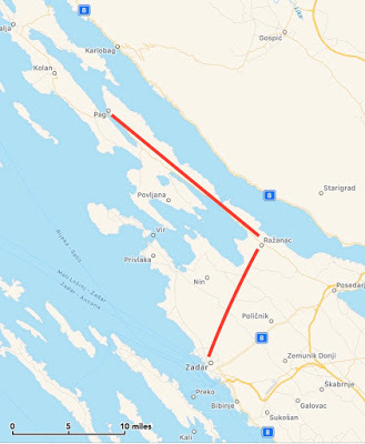 Pag Island, or Otok Pag, lies to the northwest of Zadar. It is situated on another of the long thin karst islands that mimic the shape of the mainland coast. Otok Pag is know for several things. The first is that the winds slipping down from the coastal mountains come to Pag bearing salt. The boral wind scoops the salt out of the Adriatic and deposits it on the rocky island, creating a landscape consisting of dramaticaly exposed stone and not much else. There are a few scrubby shrubs, sparse grasses, and that is about it. The second thing that Pag is famous for is cheese. Sheep and goats are the only livestock that can live on the salty grass. The combination of sheep, goats, and abundant salt results in the cheese that bears Pag's name. The last thing Pag is famous for is the hedonistic party resorts at Novalja, which is located on the far northern end of the island. While I am all for hedonism, we were heading for the more sedate destination of Pag Town.