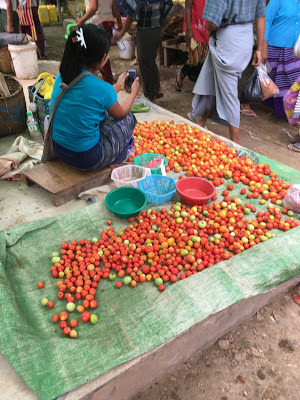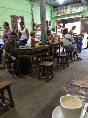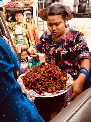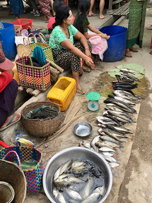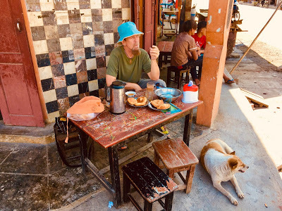We slipped out of the mayhem and into a smaller lane of shops and curry huts. A Myanmar Grandma motioned us into her joint, got us seated, and told us we were having curry. Curry: it's what's for lunch. Once all the many dishes were on the table, Grandma and her granddaughter joined us at the table. The curry was good, although it was best not to examine the kitchen area with too sharp an eye.