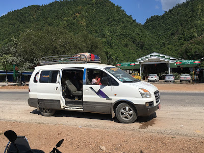 The Vomit Van stop was next to our guesthouse. There are no set fares, no schedule; the vans leave when they are full. The sleazy bus guy quoted us an exorbitant price, and the hard haggling started. Once we got the fare down to the proper range, we had to wait on a van. There were some shenanigans with an actual bus that would barely run, and we the only ones one it. When we protested and demanded our money back, a functioning Vomit Van appeared, along with the smiling sleaze ball. Finally sorted, we crammed into a van full of locals; full being the operative word.