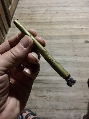 The was travel done, the bungalow occupied, and dinner was found and consumed. It was time to enjoy the veranda and the sensation of sitting still. For me, that means a good evening smoke. I set aside my traditional cigar for the equally traditional Burmese Cheroot. These rustic smokes have a long history in Burma, now Myanmar. The outside wrapper is dried leaf of carbia myxa (thanal-phet). The filler is a mixture of bits of dried wood and crushed tobacco. The Cheroot features a filter of a sort; a rolled section of corn husk. The result is pungent and sharp, nothing that is going to win away fans of Cuban puros.
