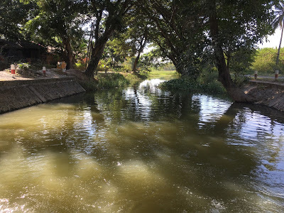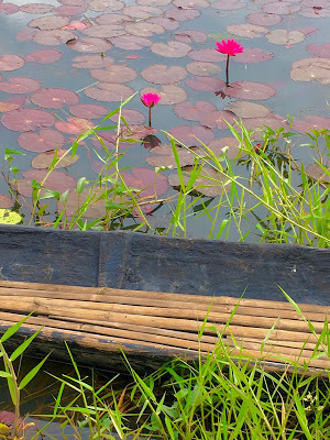 At the far end of the lane, defining the very large square we seemed to be circumnavigating, we bumbled into a farmer's compound. He steered us away, but gently and with a smile. Finding a path that led north along the main canal, we strolled past a small, brightly painted temple. Lotus blossoms grew in the ditch alongside the path, anchored by long roots to the mud beneath. There is a Buddhist saying: No mud, no lotus.