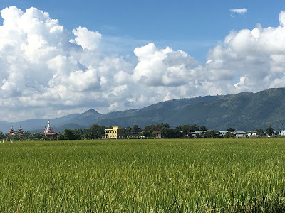 Our breakfast, including real coffee, was served by our smiling host. The breakfast room was on the second floor of the lodge, with views all around. The land spread out before us, flat and green in the morning sun. I could see small lanes leading out into the flat, green countryside; paths that led towards the marshy lake. Clouds floated over the tops of the mountains, while a hot sun beat down on the rice paddies. It was more than a traveler could ask for, more than I could resist, and we were not long in setting out.